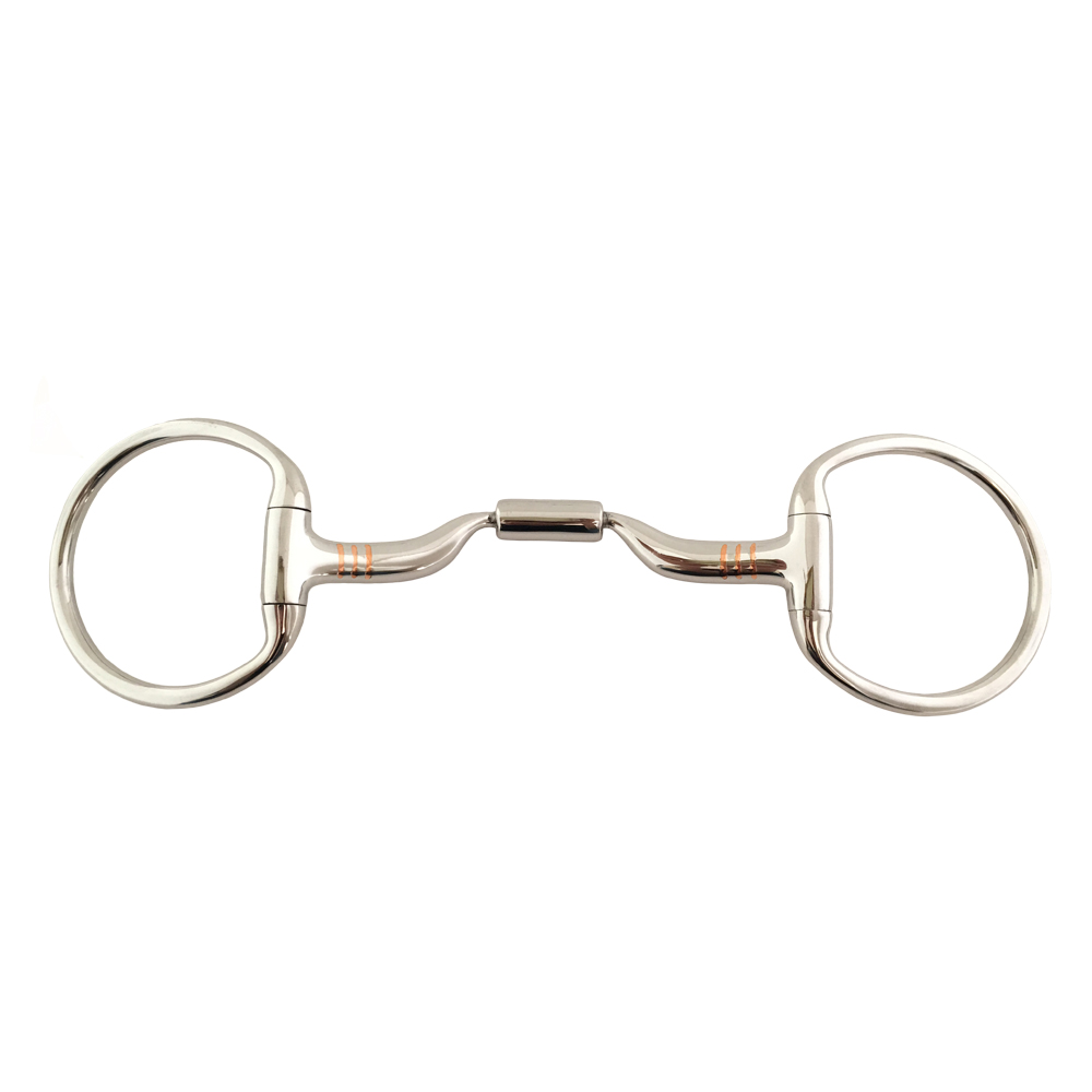 Material: A Barrel/roller covering the joint, protects the tongue from getting caught in the joint; spreads the center pressure over a wide, smoother area, preventing the nut-cracker action of traditional snaffles. Copper Inlay Small copper inserts on the mouthpiece act on the inside of the lips to encourage salvation. This helps to keep the mouth moist and comfortable. Independent side movement The clever engineering allows independent side movement. It allows the rider to isolate one side of the bit to give clear and unambiguous signals for lifting a shoulder and for balancing and bending. The joints in traditional bits often catch when one side is moved, preventing each side of the mouthpiece from working independently, and this can lead to contradictory signals and resistance.